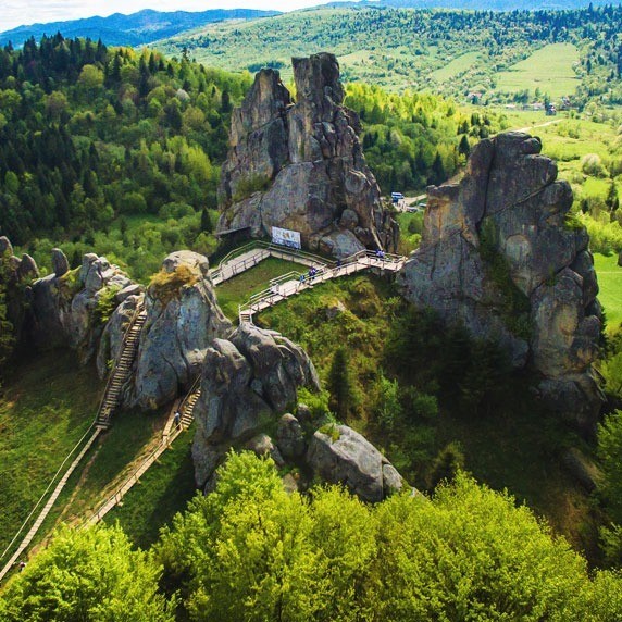 Якщо ви хочете побачити наймальовничіші скелі Українських Карпат, вам точно сюди. І це не просто скелі, а унікальний історико-ландшафтний комплекс, аналогів якому немає в усій Європі. Упродовж ІХ–ХVІ ст. тут існувала наскельна фортеця-митниця Тустань: давні будівничі «наростили» на скелях дерев’яні конструкції, створивши неприступну твердиню. Дерево, звісно, до нашого часу не збереглося, а ось вирубані у скелях пази і численні солярні знаки й інші загадкові символи на камені можна побачити і тепер.
